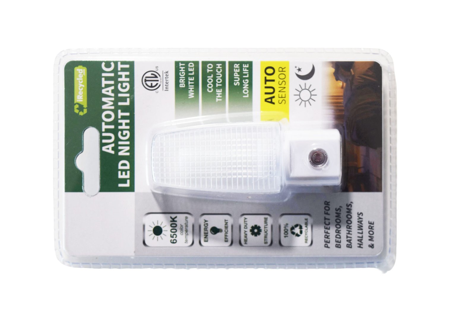 This LED night light features a built-in automatic sensor that intelligently controls the switch based on ambient light—turning on automatically in the dark and off in daylight, eliminating the need for manual operation. It uses a bright white LED with a 6500K color temperature, providing clear and soft illumination, suitable for various scenarios such as bedrooms, bathrooms, and hallways. The product is energy-efficient, has a sturdy structure, remains cool to the touch, and offers a super long LED service life. The packaging is 100% recyclable, adhering to eco-friendly concepts. The lamp body has a simple design with a standard plug at the bottom for plug-and-play convenience, making it an ideal choice for daily home lighting and night-time auxiliary lighting.