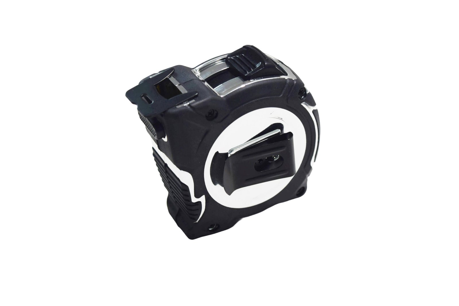 This tape measure adopts a sturdy black shell with a silver decorative ring, and the design combines texture and practicality. The tape can retract automatically, and there is a metal hook at the front for easy fixation on the edge of an object for measurement. The side is equipped with a non – slip textured grip area to improve the comfort and stability during operation. The top is equipped with a locking button to fix the length of the tape and prevent retraction. The overall structure is compact, drop – resistant and wear – resistant, suitable for construction and decoration, engineering measurement, daily DIY and other scenarios. The scale is clear and accurate, and it is a reliable tool for professional measurement and home use.