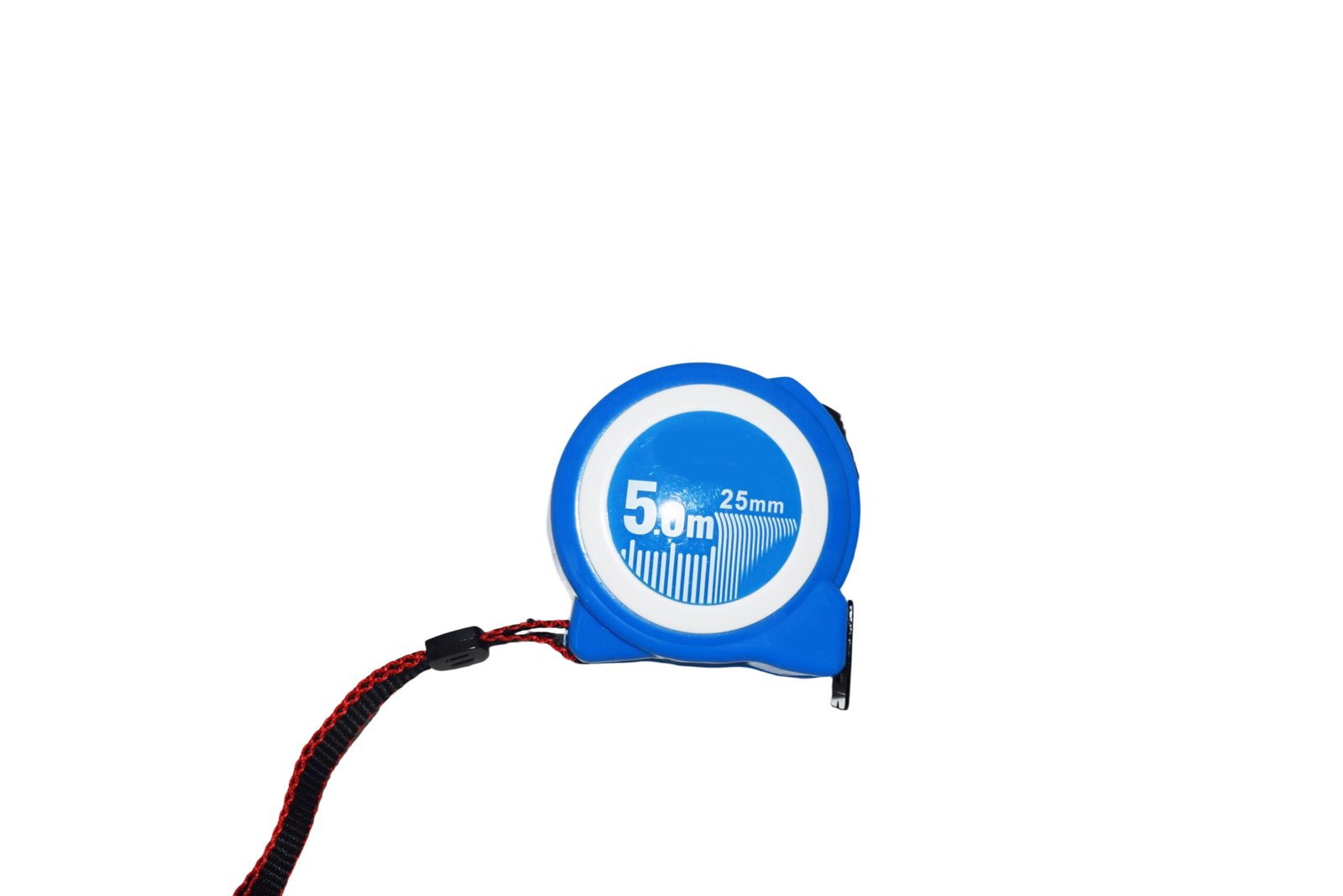 This blue tape measure has a length of 5.0 meters and a width of 25mm. It features a vibrant blue casing, making it aesthetically pleasing and easy to identify. The tape measure comes with a red and black wrist strap for convenient carrying and use. Suitable for various measuring needs, it is an ideal tool for both home and construction sites.