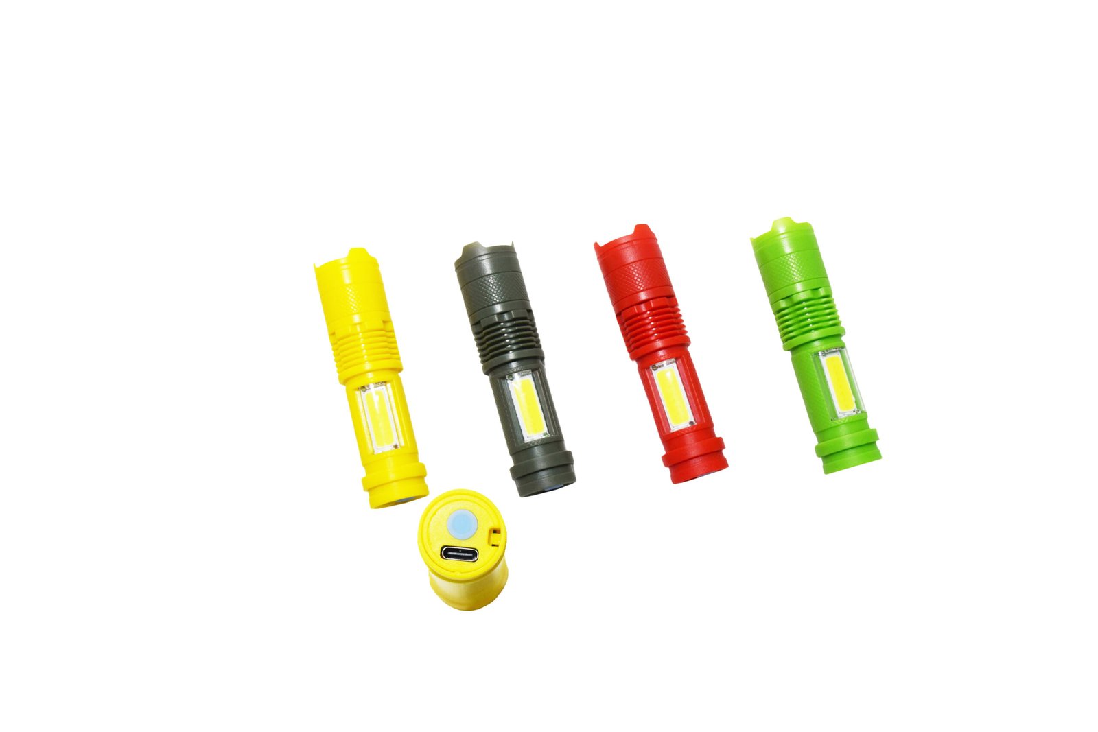 This mini COB flashlight comes in rich colors (yellow, gray, red, green are optional), with a small and lovely design. It adopts a plastic shell, and the COB LED chip is embedded in the transparent window in the middle, emitting uniform light. The top is equipped with a hanging ring structure, matched with a braided lanyard (or integrated lanyard design), which is convenient for carrying or hanging. The tail (or bottom) is equipped with a Type – C charging interface (visible from the disassembled diagram), supporting convenient charging. The overall light and durable, suitable for children’s play, daily small – range lighting, outdoor camping and other scenarios, with simple operation and one – key ignition.