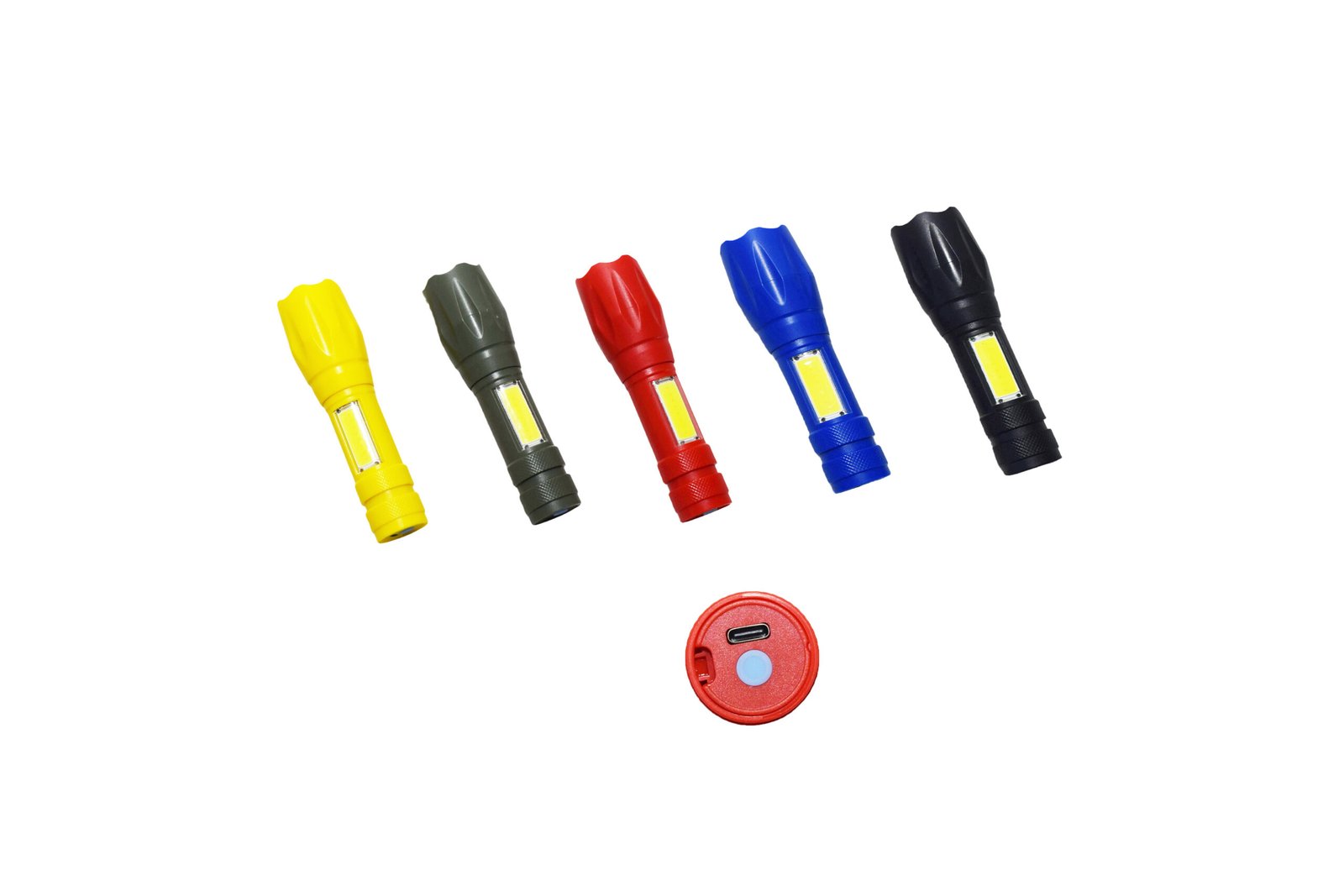 This mini COB flashlight has a rich color selection (yellow, gray, red, blue, and black are optional), with a small and delicate appearance design. It adopts a plastic shell, and the COB LED chip is embedded in the transparent window in the middle, emitting uniform and moderately bright light. The tail is equipped with a Type – C charging interface (visible from the disassembled diagram), supporting a convenient USB charging method. The cylinder body is designed with anti – slip texture, providing a comfortable grip and being less likely to slip off. The top is equipped with a hanging ring structure, matched with a braided lanyard (or integrated lanyard), which is convenient for carrying or hanging. The overall light and durable, with simple operation, one – key to turn on, suitable for children’s play, daily small – range lighting, outdoor camping, emergency backup and other scenarios.