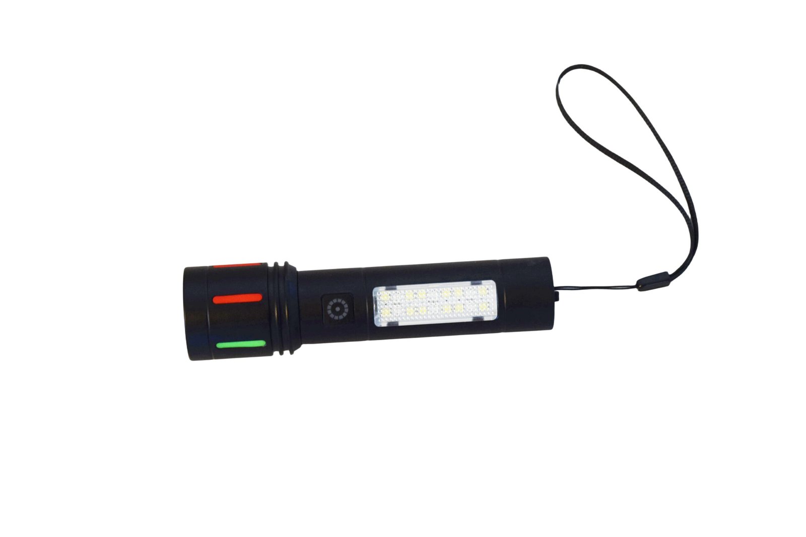 This is a powerful black multi-function LED work flashlight. It features a robust cylindrical body in a subdued black color. Its most distinctive characteristic is a large rectangular LED panel integrated into the middle of the barrel, which emits bright white light as the main illumination area. A circular control button is located next to the panel for operating various functions. The side of the front end (main light head) features prominent red and green striped sections, possibly serving as power indicators or mode identifiers. A practical lanyard is attached to the end for easy carrying and loss prevention. Presented against a pure white background, the product’s strong black-and-white contrast and industrial design language highlight its professional and reliable tool attributes, making it ideal for various scenarios such as maintenance, inspection, and camping.