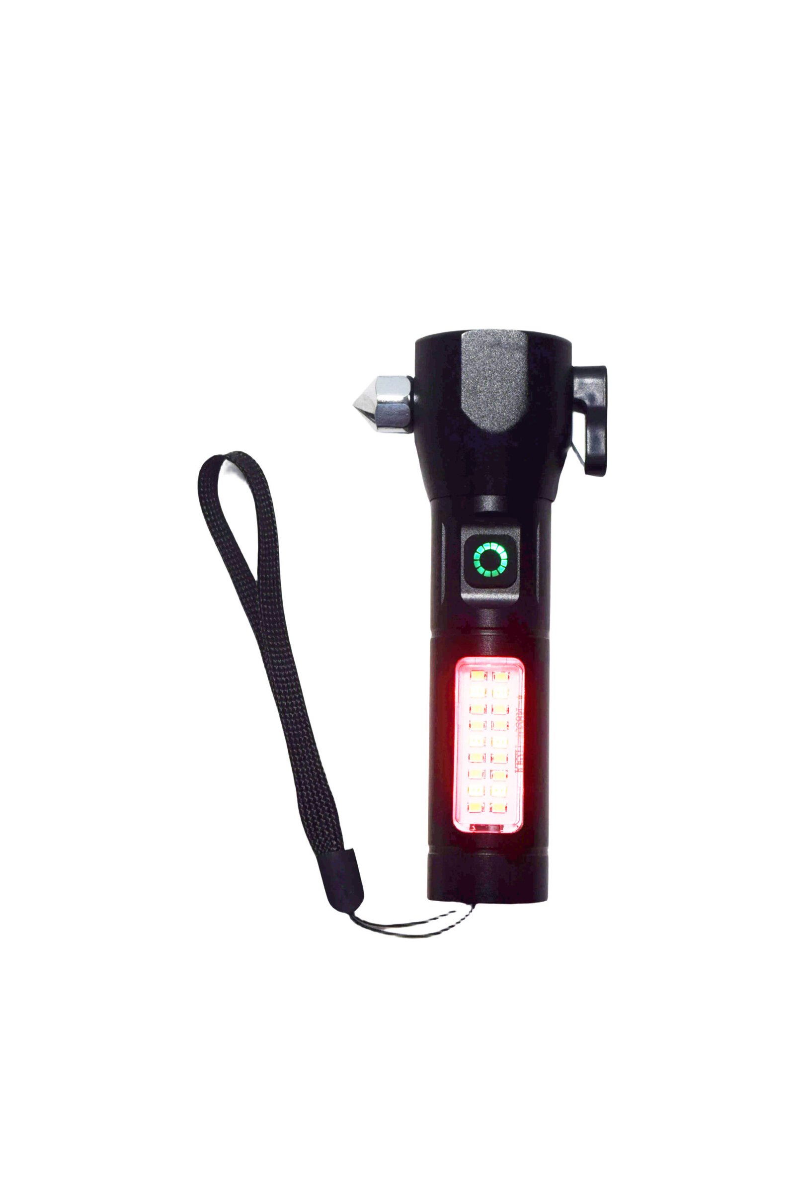 This multifunctional safety hammer flashlight integrates lighting and emergency rescue functions. The main body is black, with a COB LED light (red light area) on the front, which can provide warning or lighting; a green ring – shaped battery level indicator is set on the side to intuitively display the remaining battery. The top integrates a metal safety hammer (window breaker) and a foldable seat belt cutter, suitable for car emergency escape scenarios. A braided lanyard is equipped at the tail for easy carrying or hanging. The overall design is compact and sturdy, combining practicality and portability, and is an ideal tool for vehicle – mounted emergency and outdoor safety.