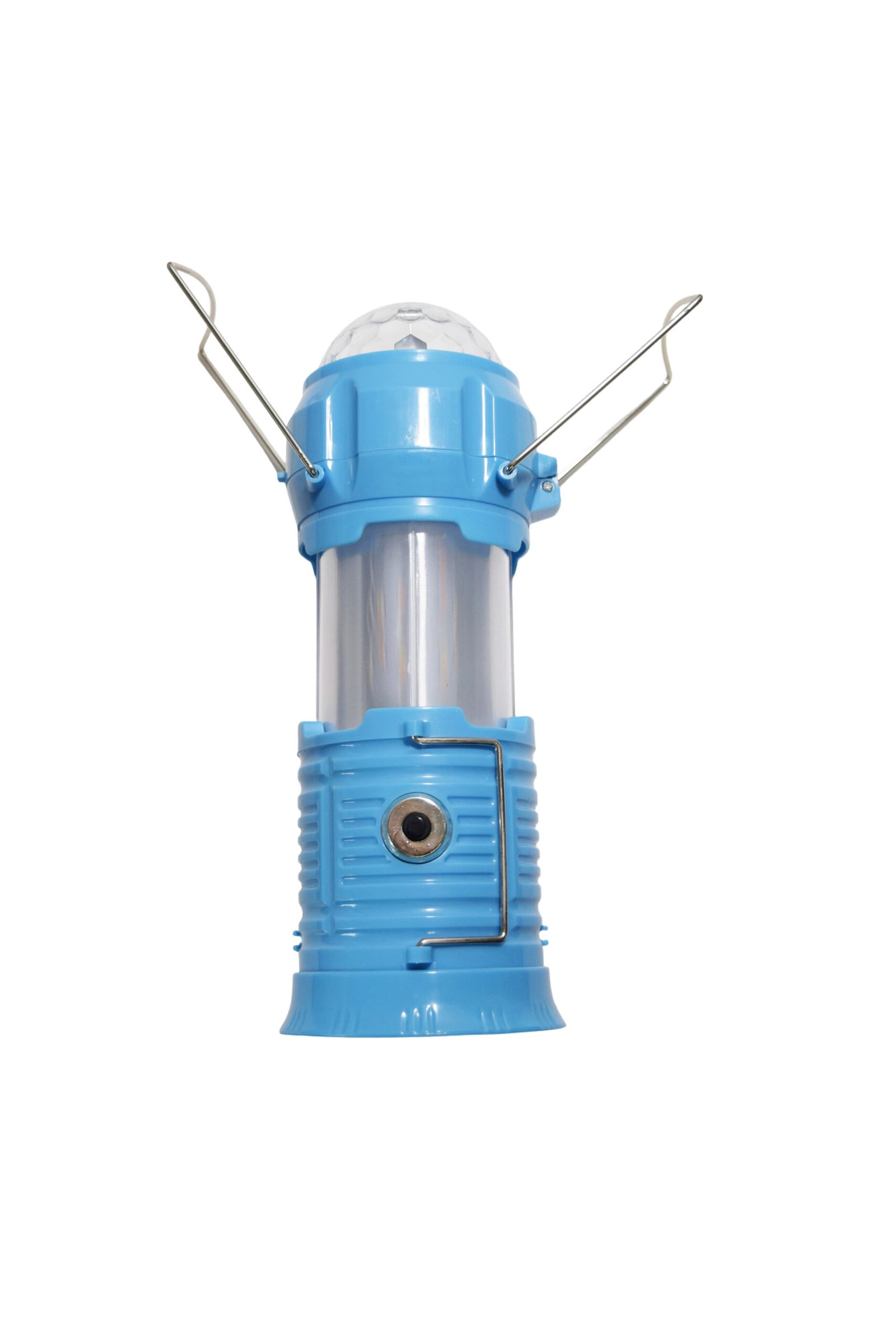 This is a portable camping lantern designed for outdoor activities and emergency use. The lantern features a durable blue plastic housing with a clear, spherical top that diffuses light evenly. It is equipped with two metal handles for easy carrying or hanging, making it ideal for camping trips, hiking, or power outages. The lantern operates with a simple on/off switch located at the base and is powered by batteries, ensuring reliability in any situation. Its compact and lightweight design makes it easy to store and transport.