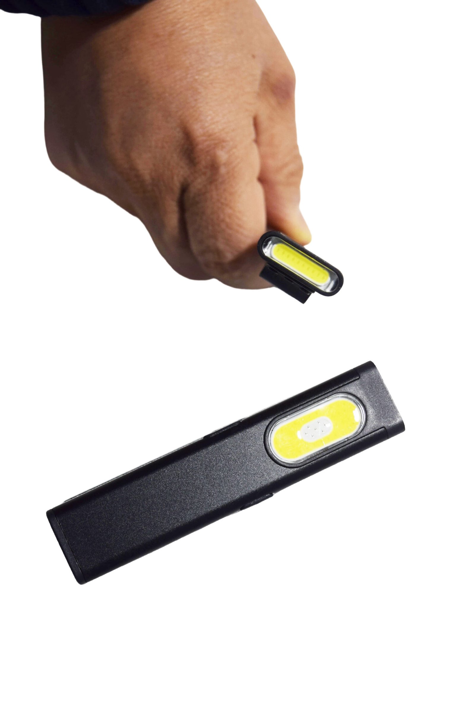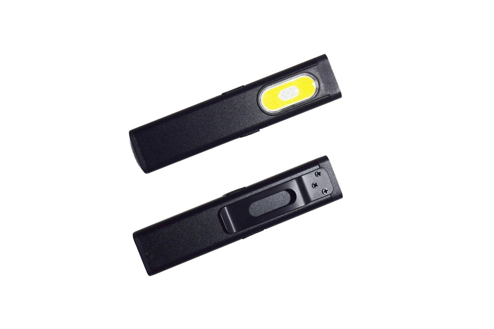 This flashlight adopts a compact long – strip design, with a black anti – slip shell for comfortable grip. The front is equipped with a bright COB LED light – emitting area, which can provide uniform and sufficient illumination. There is a clip structure on the side, which is convenient for clipping on pockets, backpack straps or books, making it easy to carry around and free hands. There may be a switch button (the operation area on the side is visible in the figure) at the bottom or on the side to switch lighting modes or control the switch. It is suitable for daily maintenance, outdoor camping, reading fill – light and other scenarios, and is a highly practical and portable lighting tool.