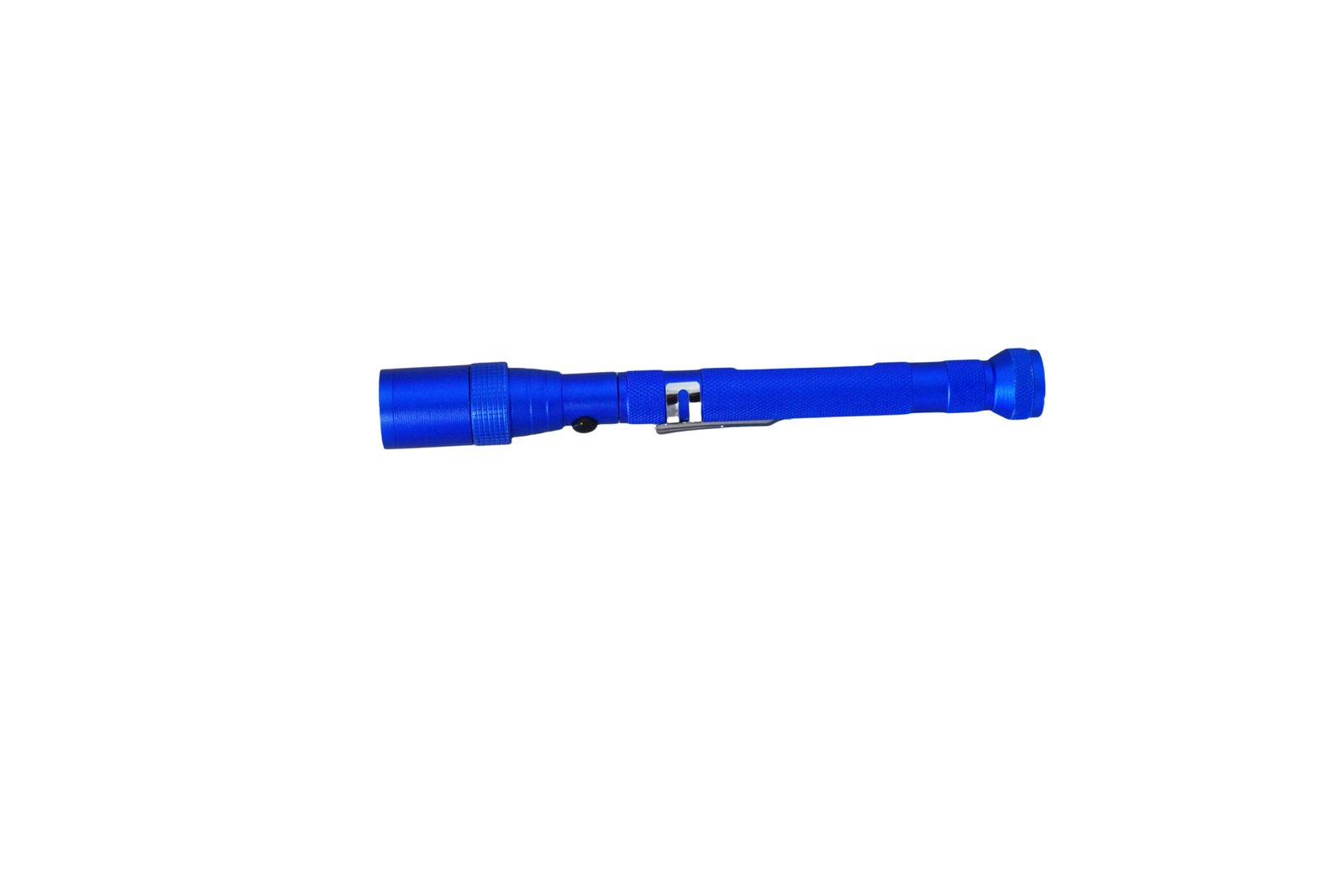 This is a compact blue portable flashlight with a pen-style design. Its main body has a classic straight tube shape, with a slightly bulbous tail, likely housing the batteries. The front end is the light head, and the middle section features a textured grip for better handling, along with a silver metal clip for attaching it to a pocket or toolbag. A small black push-button switch is located behind the grip for power control. The overall appearance is simple and utilitarian, with an aluminum alloy construction that gives it an industrial feel.