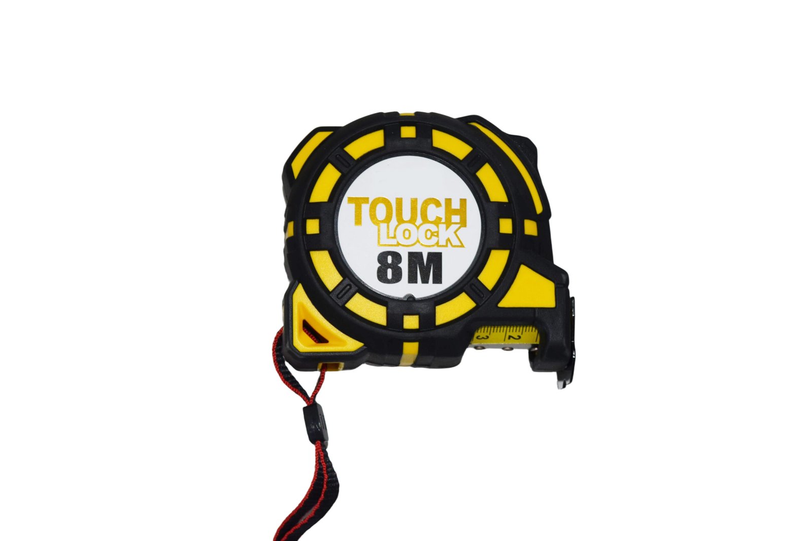 This Tough Lock tape measure has a length of 8 meters. Its casing is made of high-strength plastic in a black and yellow design, making it sturdy, durable, and easy to grip. The tape measure features a “TOUCH LOCK” automatic locking function, ensuring the tape remains secure and does not retract easily during measurement. It comes with a red and black portable wrist strap for convenient daily carrying and use. Suitable for construction, renovation, and daily measurements, it is an ideal choice for professionals and DIY enthusiasts.